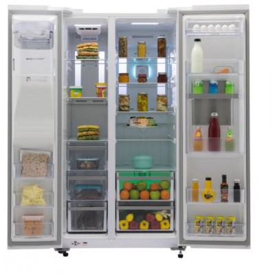 این مدل یخچال ساید بای ساید دارای امکانات و ویژگی های متعددی است که استفاده از آن را بسیار راحت تر و لذتبخش تر میکند. یکی از ویژگی های مهم در این مدل مدیریت تنظیمات یخچال فریزر با گوشی موبایل از طریق اپلیکیشن SMARTBOOM است، از جمله قابلیت های این محصول که با اپلیکیشن قابل دسترسی است میتوان به مانیتورینگ 24 ساعته عملکرد یخچال فریزر از طریق اینترنت، در صورت بروز خطا یا خرابی در دستگاه، واحد خدمات انتخاب با کاربر تماس می گیرد. اعلام هشدار های نگهداری مثل زمان تعویض فیلتر آب در اپلیکیشن SMARTBOOM کاربر می تواند عملکرد دستگاه را از طریق گوشی موبایل روی یکی از حالت هاي پیش فرض VACATION ،GUEST ،FRESHNESS و ECO تنظیم کند. صفحه نمایش دیجیتال و لمسی این دستگاه، امکان تنظیم دما و کنترل عملکرد های مختلف را به آسانی فراهم می کند. سیستم گردش هوای چندگانه (Multi Air Flow) با توزیع یکنواخت هوا در تمام قسمت های یخچال و فریزر، از خراب شدن زود هنگام مواد غذایی جلوگیری می کند.
